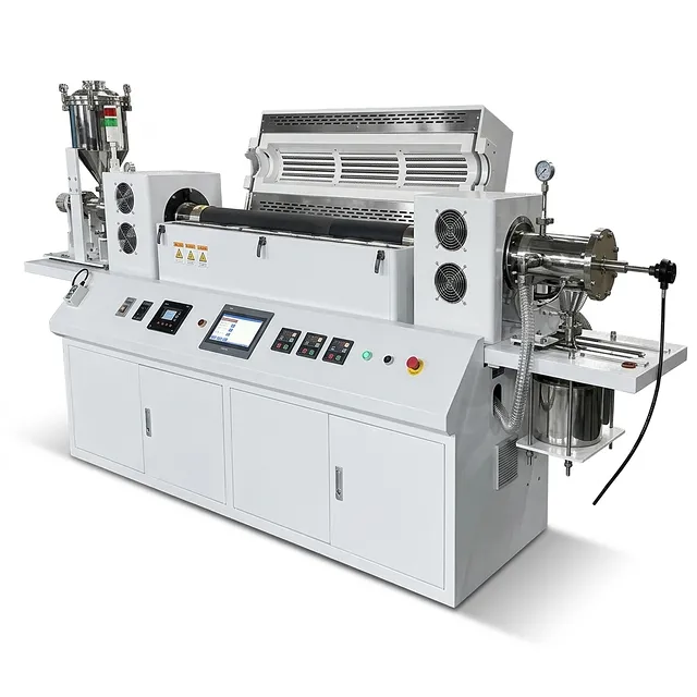 진공 밀폐형 연속 작동 회전 튜브 가열로는 제어된 분위기와 온도 프로파일을 유지하면서 작업 튜브를 통해 재료를 연속적으로 이동시키는 원리로 작동합니다. 가열로 튜브는 일반적으로 고순도 석영 또는 알루미나로 만들어지며, 실리콘 카바이드와 같은 고온 가열 요소를 사용하여 가열됩니다. 처리할 재료는 가열로 튜브에 연속적으로 공급되고 회전 메커니즘에 의해 튜브를 통과합니다. 이러한 연속적인 움직임은 재료의 전체 표면적이 원하는 분위기와 온도에 노출되도록 하여 균일한 처리와 향상된 제품 균질성을 이끌어냅니다. 진공 밀폐를 통해 음압 또는 불활성 가스 환경에서 처리할 수 있어 산화 또는 기타 바람직하지 않은 반응을 방지합니다.